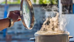 - Vypněte, odstavte z plotýnky a nechte jasmínovou rýži pod pokličkou ještě asi 10 minut takzvaně „dojít“. Jakmile se do rýže vsákne veškerá tekutina, máte hotovo. Před samotným podáváním ji můžete zlehka nakypřit vidličkou.